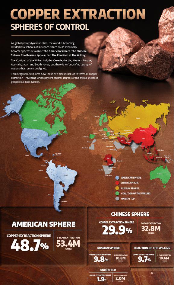 不过,美国作为头号资本强国,通过跨国矿业巨头控制着众多优质铜矿资源。根据MINING网站和北方矿业绘制的“铜势力地图”,美国掌控全球48.7%的铜资源,中国只能掌握29.9%。