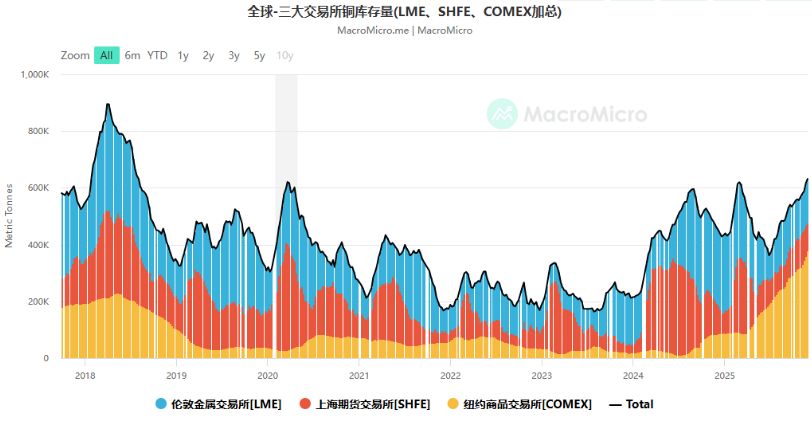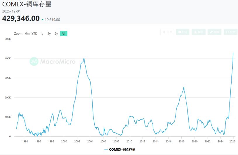 COMEX铜库存已经暴涨到近40万吨(43.4万短吨,约合39.4万吨)!而伦敦LME铜库存已经从2024年的32万吨腰斩至16万吨,上海SHFE铜库存更是跌破了10万吨!