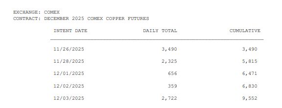 11月不是大月,COMEX铜期货却交割了14145张仓单,大约32.8万吨(353625短吨)!而且到12月3日,COMEX铜期货又已累计交割9552张仓单,约21.66万吨(238800 短吨)!
