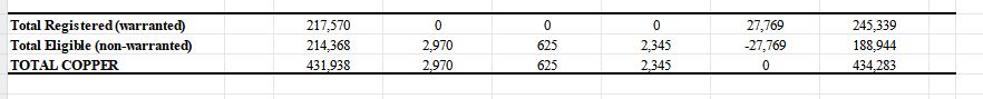 分析12月2日的COMEX铜期货库存单,一天就有5940短吨(约合5,389 吨)现货铜入库,同时有高达27769短吨(约合25,190吨)从合格铜转化为注册铜,即从“不可交割”状态转为“可交割”,为后续可能出现的大规模交割做准备。