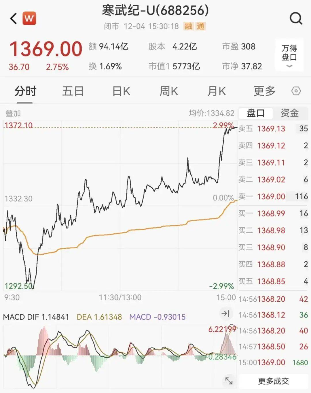 最终,寒武纪收涨2.75%,报1369元/股,总市值5773亿元。截至本周四收盘,寒武纪股价今年以来累计涨幅达108%。