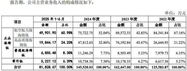 其中,航空航天级海绵钛是金钛股份绝对的营收主力。2022年-2024年、2025年1-6月(下称“报告期”),该产品的销售金额分别达8.43亿元、6.96亿元、7.57亿元和5亿元,营收占比分别为67.16%、42.83%、52.04%和60.98%。