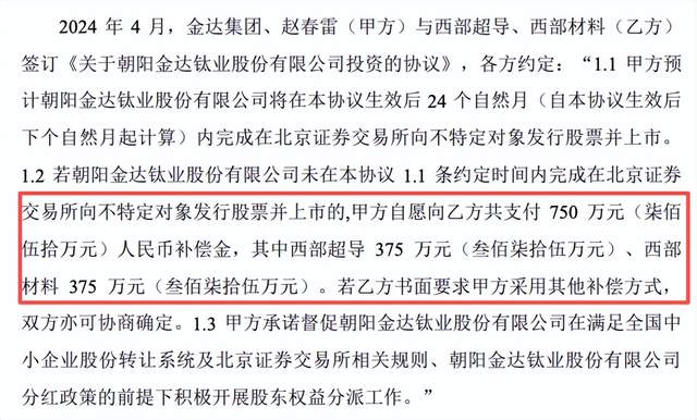双方同时还签订了一份协议,协议规定若双方未在24个月内完成上市,金钛股份的控股股东金达集团则需要向西部超导、西部材料各支付375万元补偿金,合计750万元。