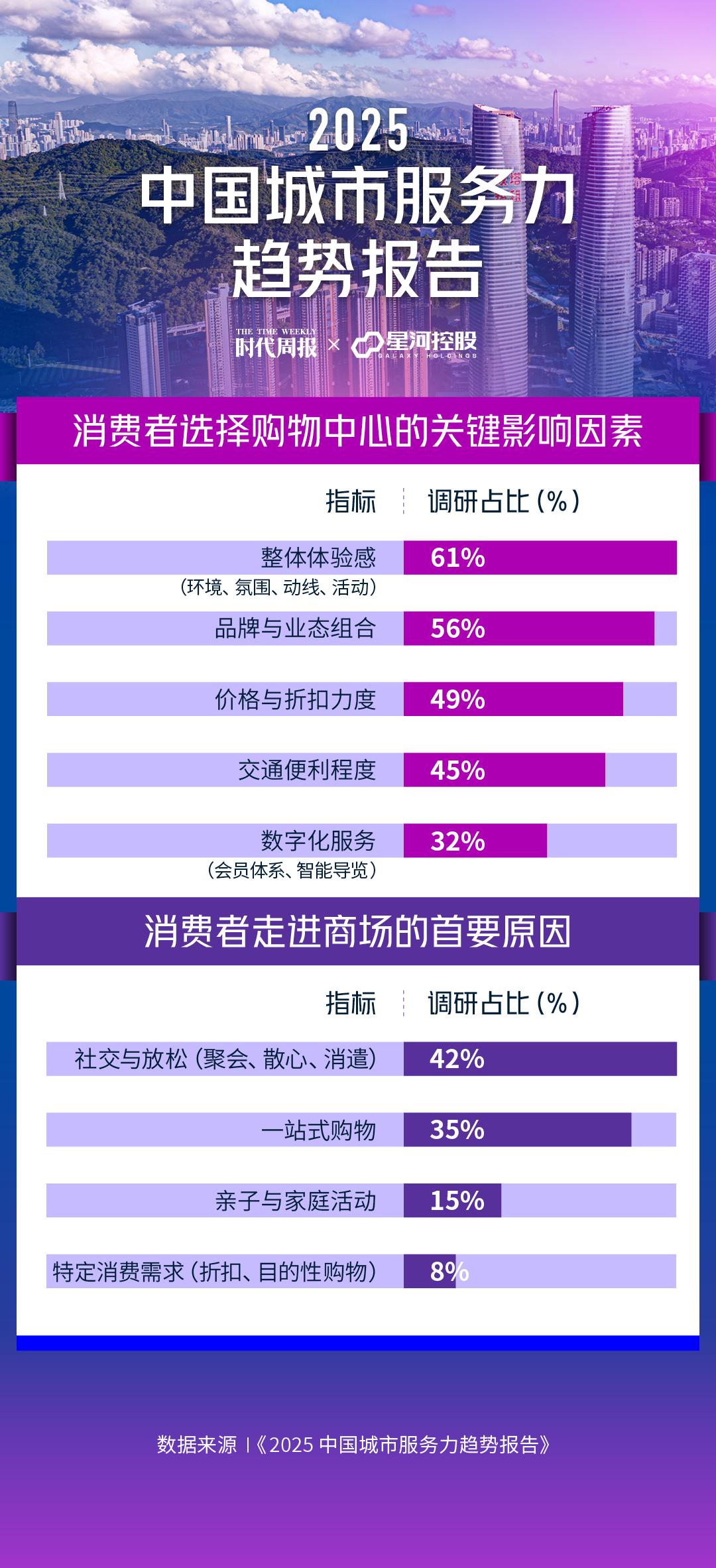 《2025中国城市服务力趋势报告》指出,这种复苏的背后,不只是消费回暖,更是服务体验重新成为商业核心。第三方报告调研也显示,61%消费者认为“体验感”(环境、氛围、动线、活动)比价格和折扣更重要,42%消费者选择“社交与放松”作为走进商场的首要原因。