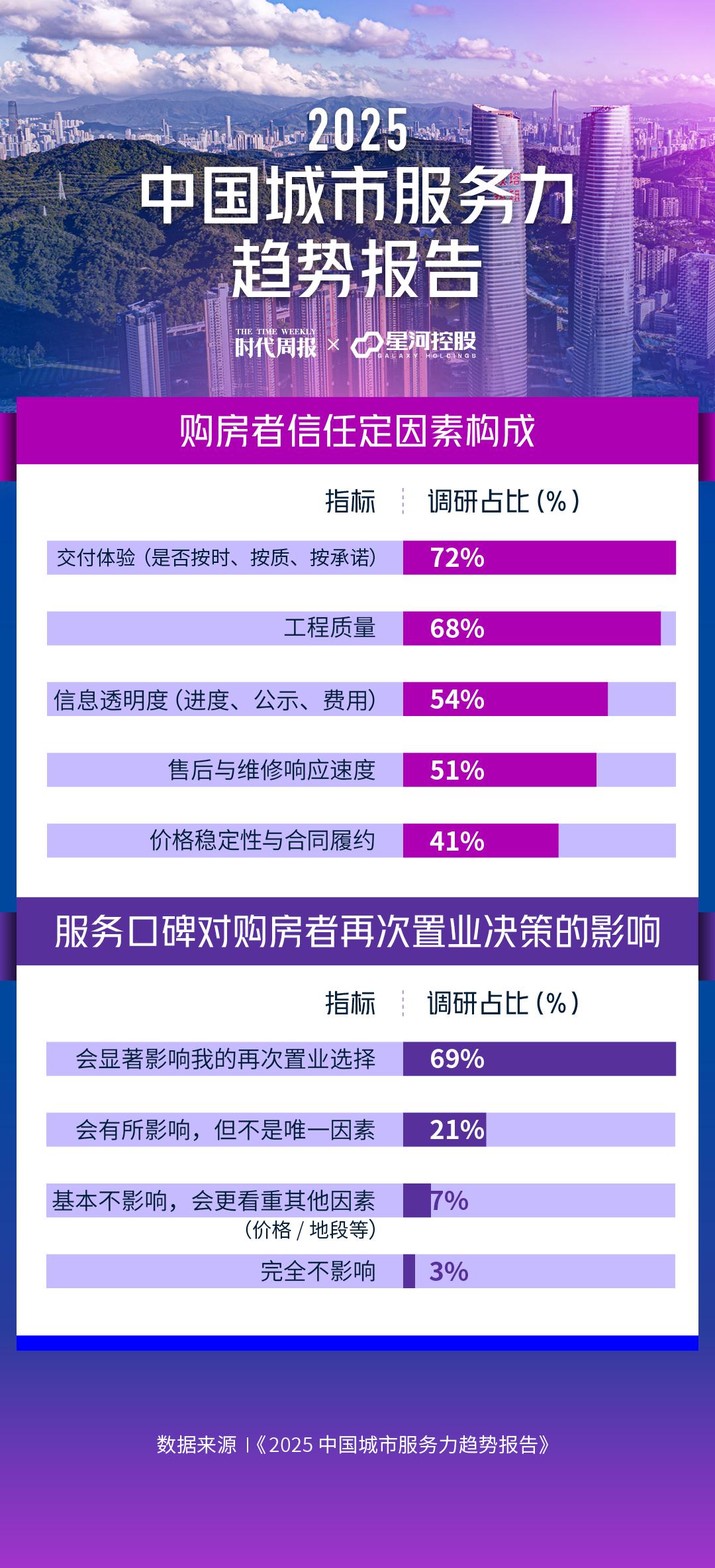 《2025中国城市服务力趋势报告》显示,72%的购房者将交付体验(是否按时、按质、按承诺)视为决定信任的关键因素,69%的购房者表示开发商的服务口碑会显著影响再次置业选择。