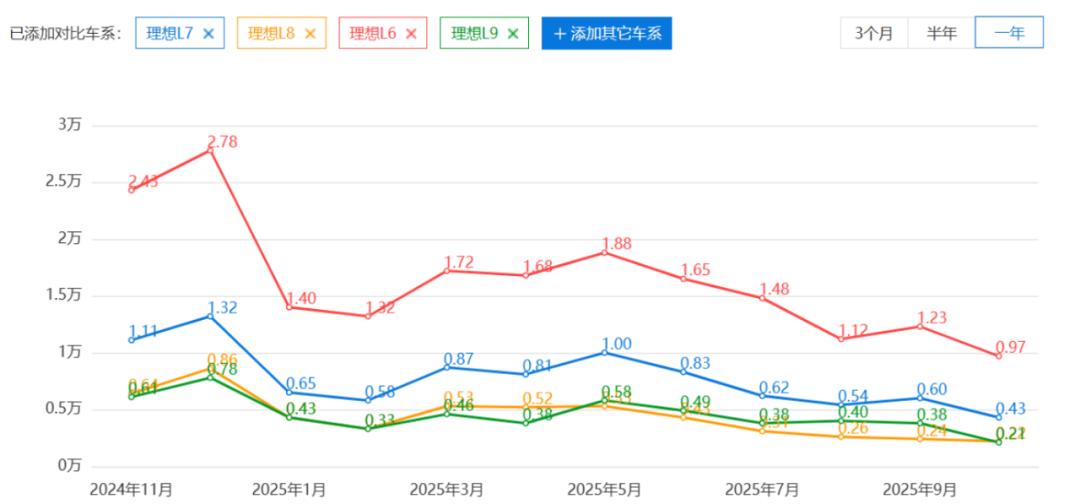 但赚钱的前提是车要卖得出去。今年以来,理想L系列的销量持续走低,来到10月,销量主力理想L6的交付已不到1万,较高峰期近乎腰斩。