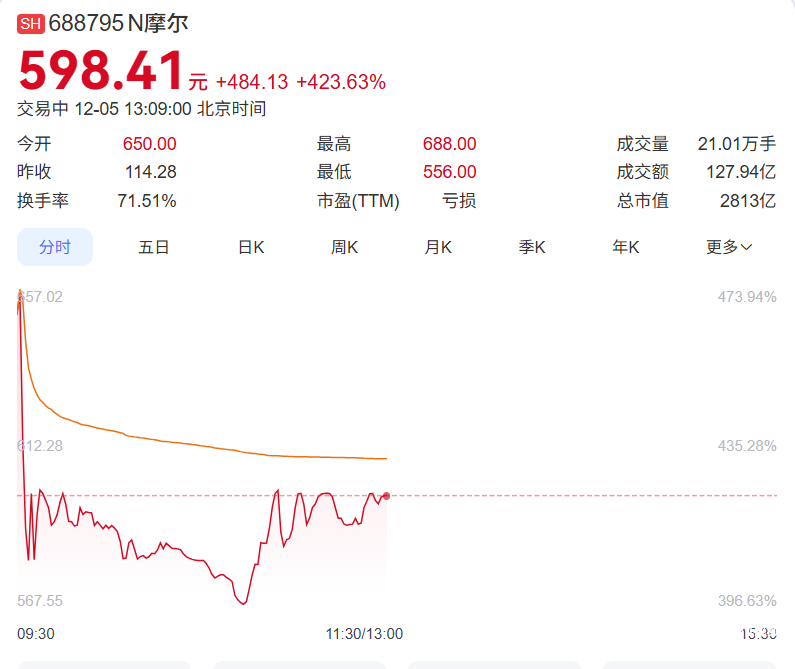 12月5日,摩尔线程头顶“国产GPU第一股”光环正式登陆科创板,证券代码为“688795”,上市首日高开468.78%,报650元/股,开盘市值超3000亿元。有投资者惊呼“摩伟达”来了。