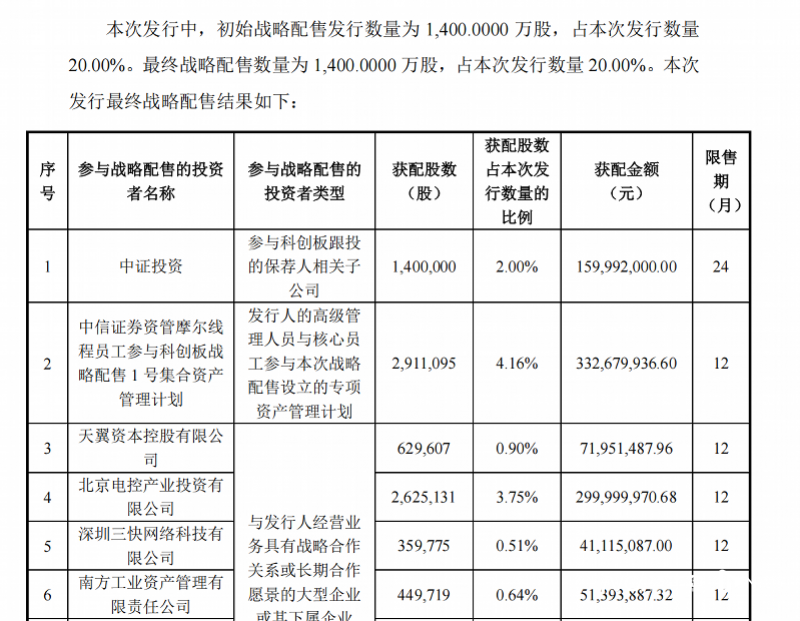 另外,有10家战略机构投资者参与了摩尔线程的战略配售,共计认购1400万股,其中,中国电信旗下天翼资本及美团旗下深圳三快网络科技有限公司等分别通过战略配售获配63万股、36万股。