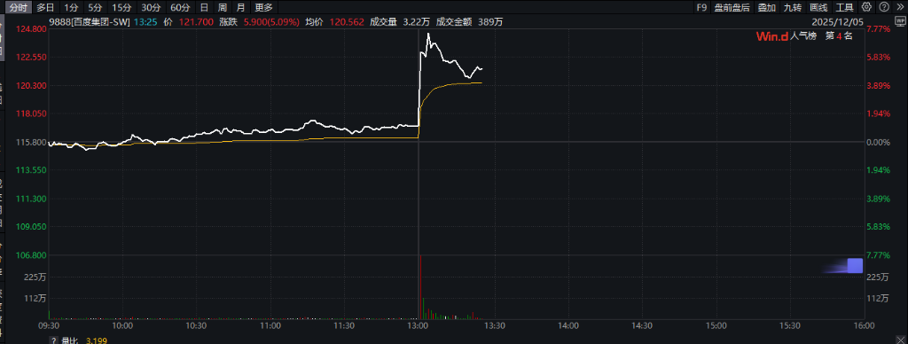 消息传出后,百度港股盘中直线拉升,一度涨近8%。