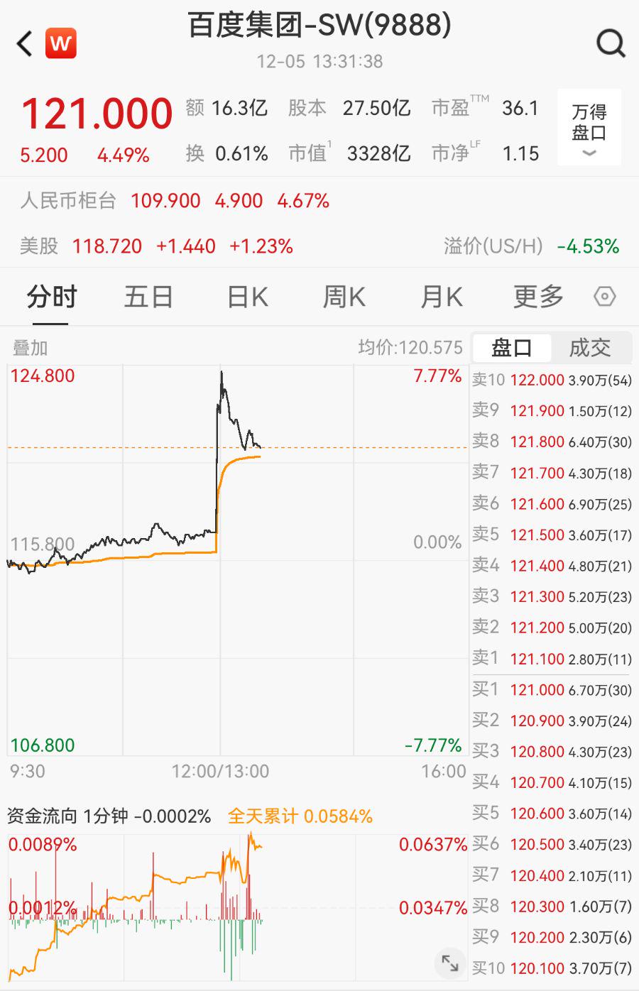 12月5日,百度港股午后突然直线拉涨,1分钟涨近5%,随后涨幅收窄,截至13:31,涨4.49%,报121港元/股,总市值为3328亿港元。