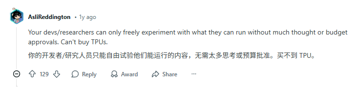 即使强兼了 PyTorch,很多底层的优化、自定义算子,换到 TPU 上还是得重新调试。专门指定的 JAX 语言,也给人才招聘垫高了门槛。