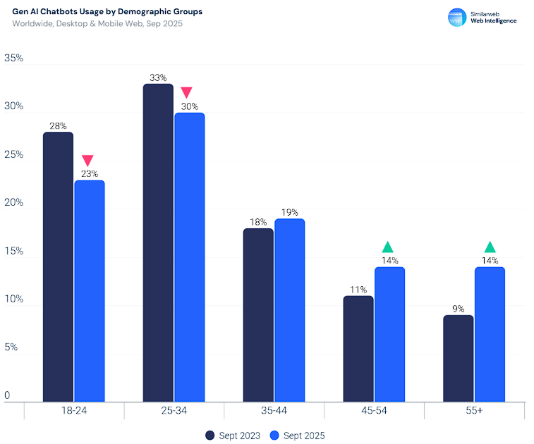 用户结构也在发生变化。虽然18至34岁用户仍占主导,但45岁及以上用户群体增速最快,目前已占总访问量近30%。这表明AI技术正在突破早期采用者圈层,向更广泛人群渗透。