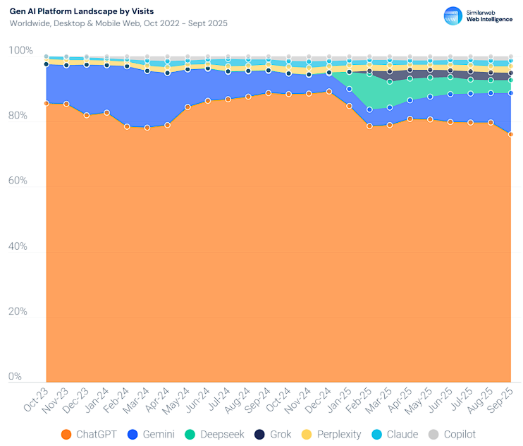 尽管面临来自Gemini、Claude和Perplexity等竞争对手的挑战,ChatGPT仍占据全球生成式AI访问量的近80%。这种压倒性优势反映出先发平台在用户习惯养成方面的壁垒效应。