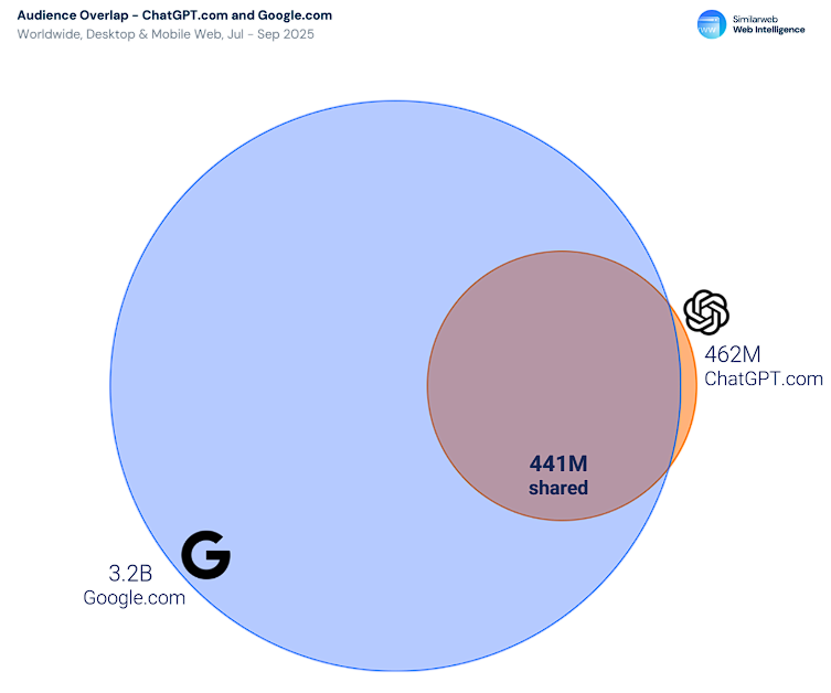 在4.62亿ChatGPT访问者中,95%同时使用Google,重叠用户达4.41亿。这表明用户会根据具体任务在对话式AI和搜索引擎之间切换。