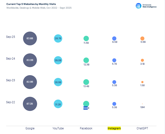 ChatGPT的市场主导地位依然稳固。OpenAI的平台从2022年约1900万月访问量增长至2025年9月的约59亿次,使其成为全球访问量前五的网站之一,与Instagram的65亿次月访问量处于同一量级。