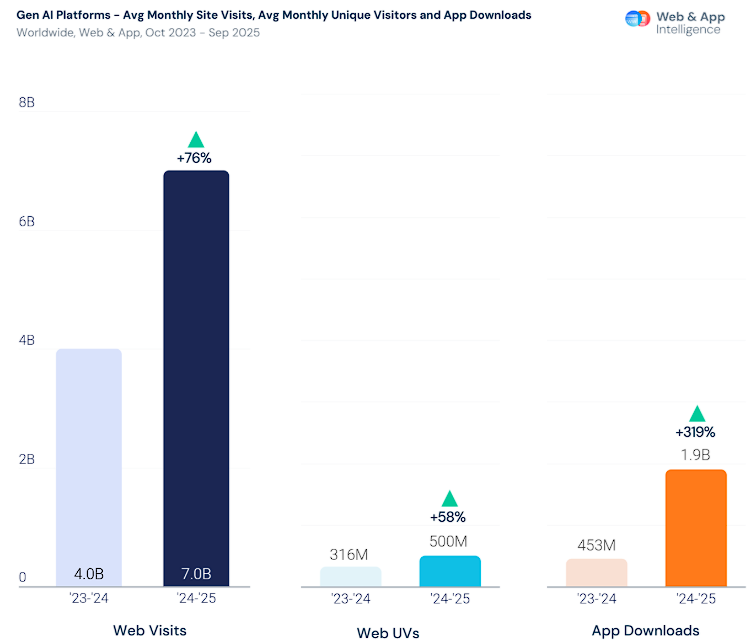 这一增长不仅体现在网页端。移动端的扩张更为迅猛,AI应用会话量在过去一年增长了五倍,应用下载量飙升778%。ChatGPT仍是流量主导者,9月访问量达到约59亿次,跻身全球访问量前五的网站。