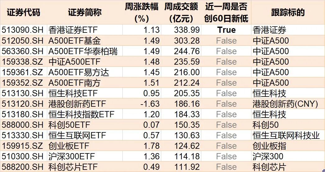 其中,香港证券ETF、A500ETF基金周成交额超300亿元。