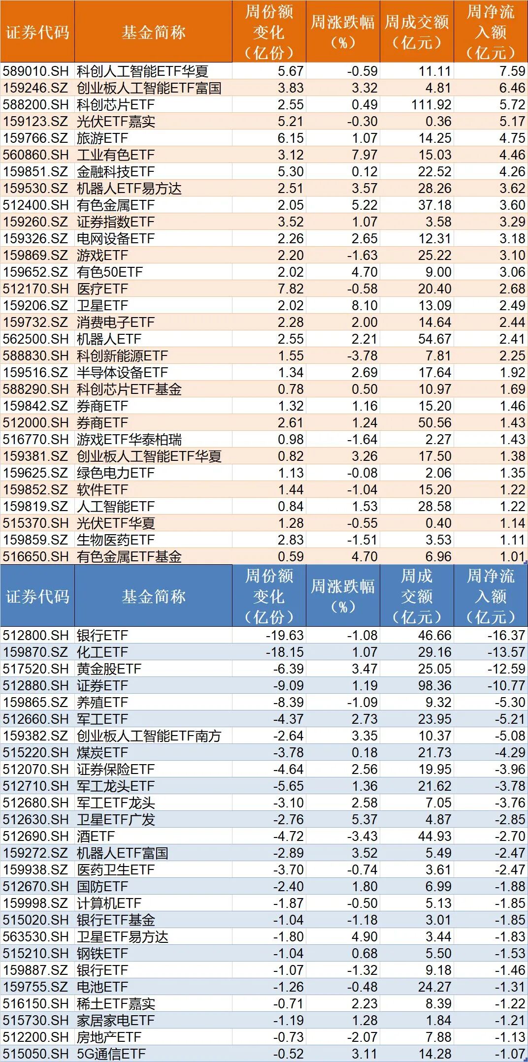 从行业主题上看,人工智能、芯片等ETF被资金看好,而银行、化工相关ETF被资金抛售。