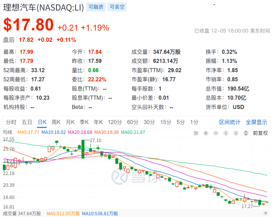 虽然理想依然是一直保持盈利态势的新势力车企,交付量也超过了150万辆,过去的成绩毋庸置疑。但当一家汽车公司的增长势头明显放缓,市场的信心与耐心都会经受考验。公开数据显示,理想汽车的当前股价为17.59美元/股,相较一年之前的46.44美元/股的股价已经下跌超过五成。