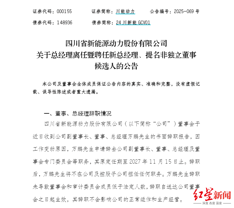 微成都报道 12月5日,川能动力(000155)发布公告称,董事会近日收到公司副董事长、董事、总经理万鹏的书面辞职报告,因工作变动原因,万鹏申请辞去公司副董事长、总经理等所有职务,其原定任期至2027年11月15日止。