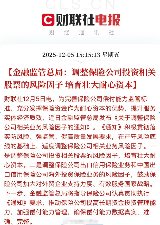 本周五,金融监管总局宣布调整保险公司投资相关股票的风险因子,要“培育壮大耐心资本”。