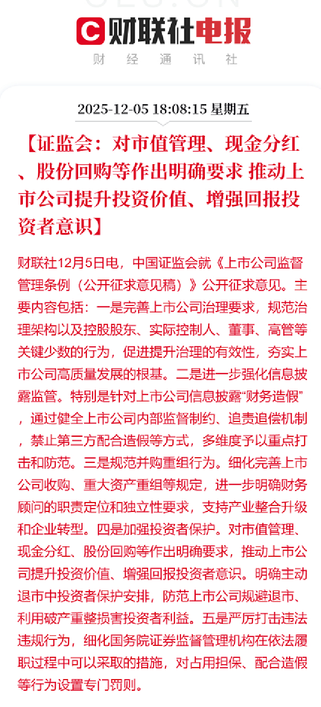 本周五,中国证监会宣布对上市公司的市值管理、现金分红、股市回购等你作出明确要求,推动上市公司提升投资价值、增强回报投资者意识。