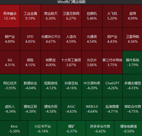 体现到板块上,大致是科技线再度“软切硬”,另有两岸融合、商业航天以及周五异动的大金融(券商、保险)涨幅领先。