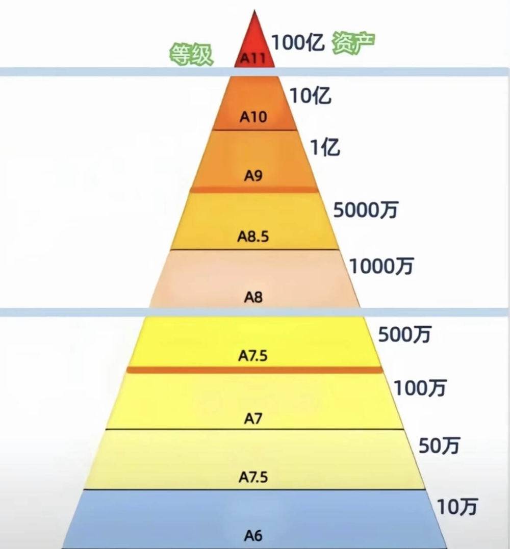 A代表资产(Asset),指个人或家庭的净资产(总资产减去总负债)。数字代表这个净资产的位数,单位是人民币。A8也就是净资产千万级别,A8.5即家庭净资产五千万元。
