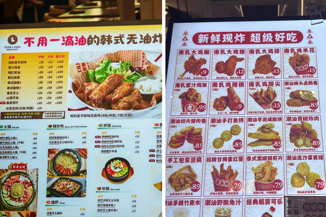另一方面,中式炸鸡强势入局,进一步挤占了韩式炸鸡的生存空间。除了早期“非油炸”的健康工艺,Thank u mom的产品数十年几乎没有实质性迭代:口味长时间依赖腌料、酱料,菜单也围绕炸鸡、拌饭、火锅“韩式三件套”展开,缺乏进一步的差异化创新。
