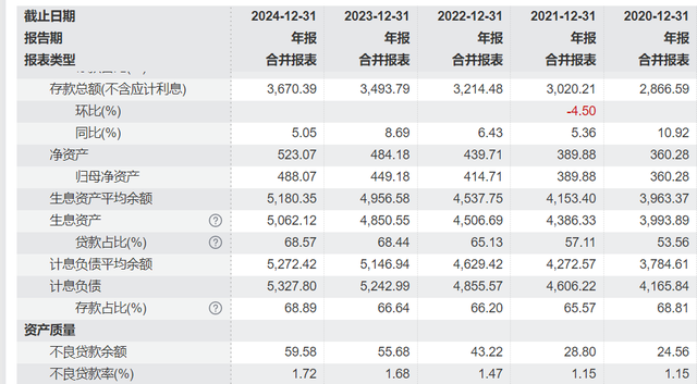 纵观近五年该行盈利表现,除了2023年营业收入与净利润出现负增长后,2024年增幅止跌回升,其中营业收入增速9.46%,创五年最高水平;净利润五年基本维持在36亿-38亿之间,2020年至2024年分别为36.71亿、37.06亿、38.29亿、37.79亿元,增速分别为3%、0.95%、3.34%、-4.6%、3.43%。