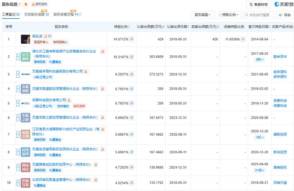 明星股东阵容为车联天下提供了强大资源支撑。天眼查数据显示,车联天下的股东名单堪称“星光熠熠”,包括蔚来资本基金、博世、四维图新等产业巨头,威孚高科技、闻塔科技等上市公司,以及无锡国资委旗下多家投资平台和国寿成达等知名机构。