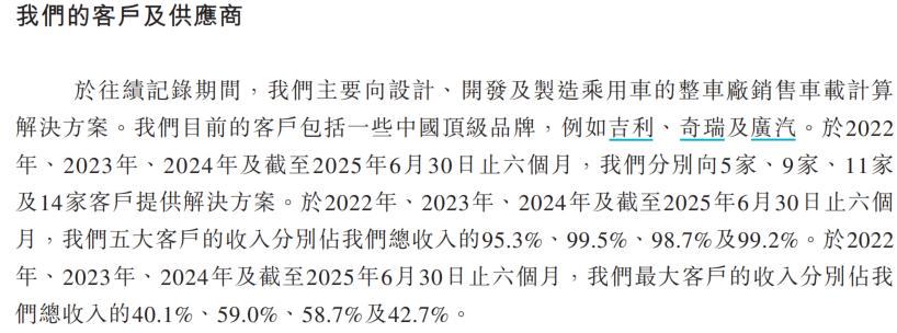 客户集中度高的风险。2022年至2024年,车联天下的客户数量从5家增加至11家,2025年上半年进一步扩大到14家。然而,前五大客户的收入占比均超过95%,其中2023年高达99.5%。
