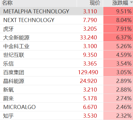 中概股逆势上涨,中国金龙指数涨约0.3%,虎牙涨近8%,大全新能源涨6.4%,百度集团涨超3%。下跌方面,泡泡玛特美股跌约8%。()
