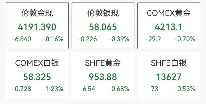 黄金白银全线飘绿,现货黄金失守4200美元/盎司,COMEX白银跌超1%。