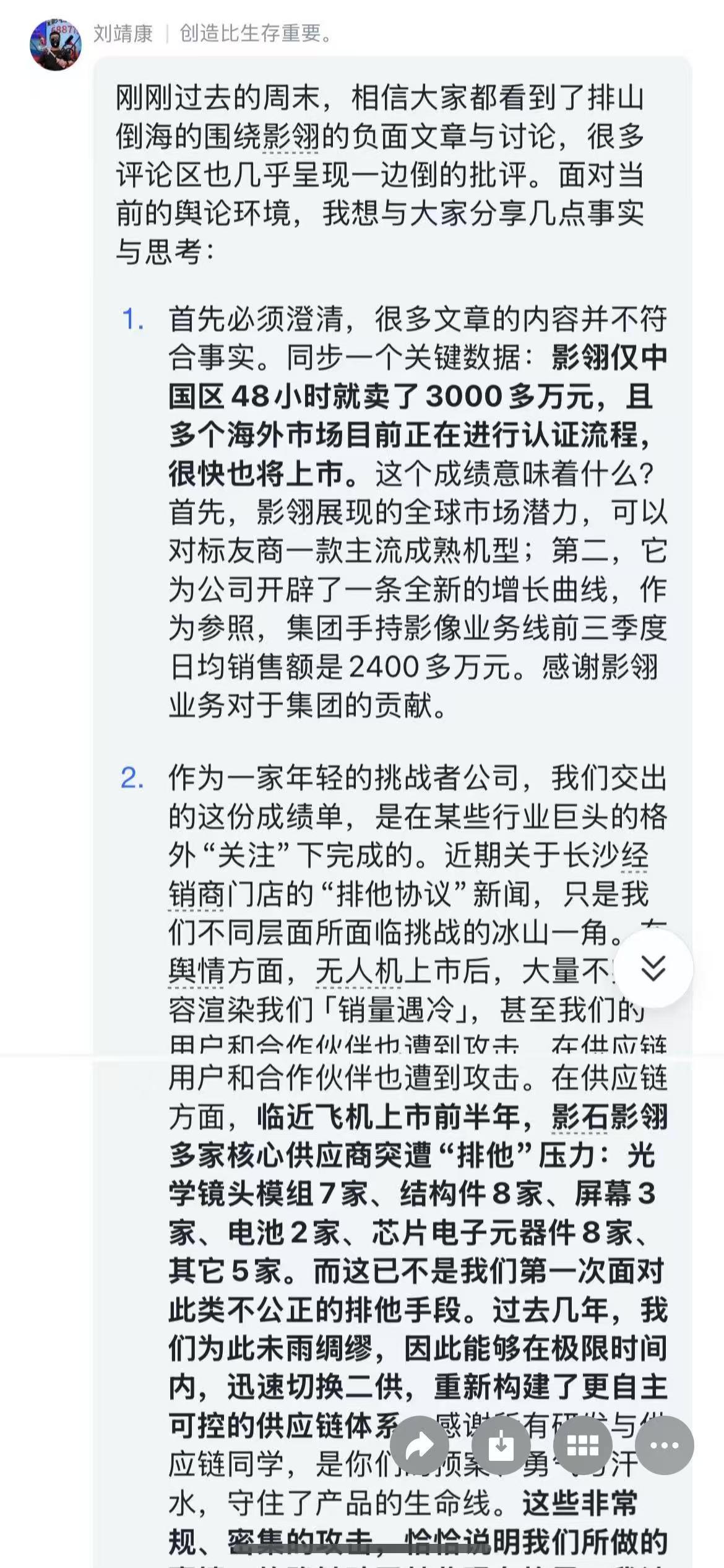 红星资本局12月8日消息 8日晚间,影石创新(688775.SH)创始人刘靖康在一份公司内部信中提到,几日前发布的影翎A1全景无人机仅中国区48小时就卖了3000多万元,且多个海外市场目前正在进行认证流程,很快也将上市。