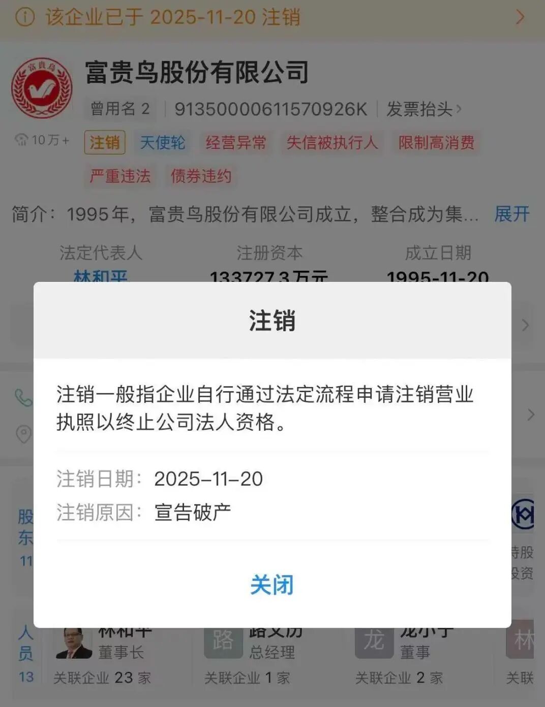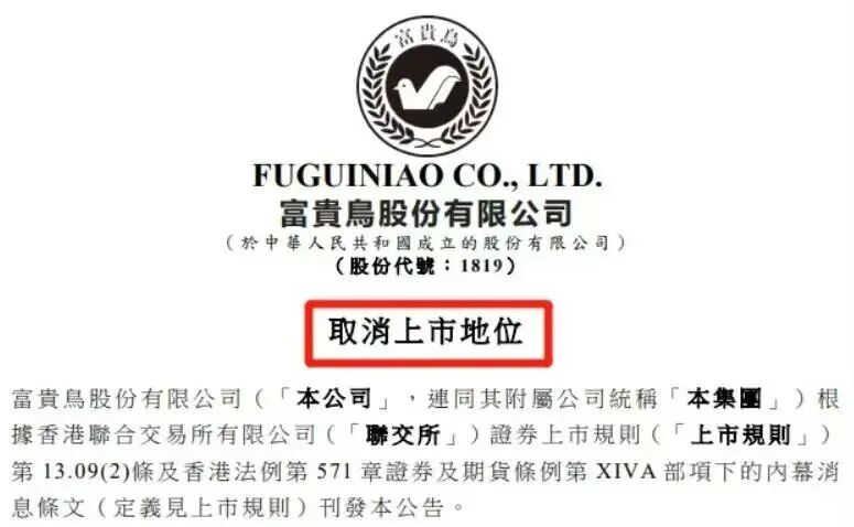 2019年7月,富贵鸟公司公告正在进行破产重整;8月,法院裁定终止重整程序,正式宣告富贵鸟破产;11月,港交所取消其上市地位,富贵鸟就此退市。