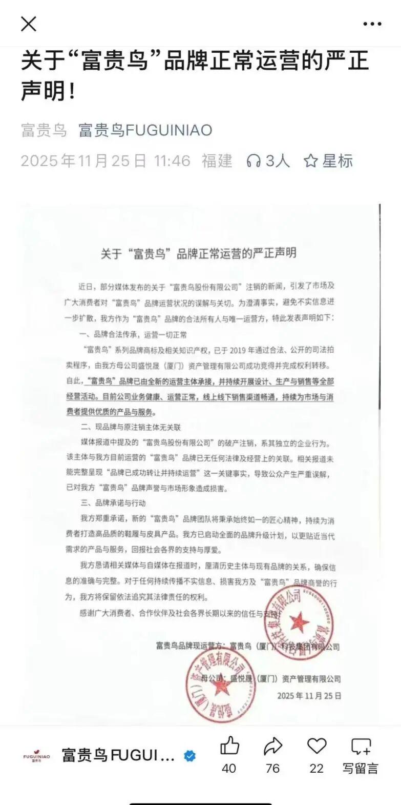 就在网友们纷纷为“鞋王落幕”惋惜时,富贵鸟(厦门)科技集团有限公司的一则《关于“富贵鸟”品牌正常运营的严正声明》打破了平静。