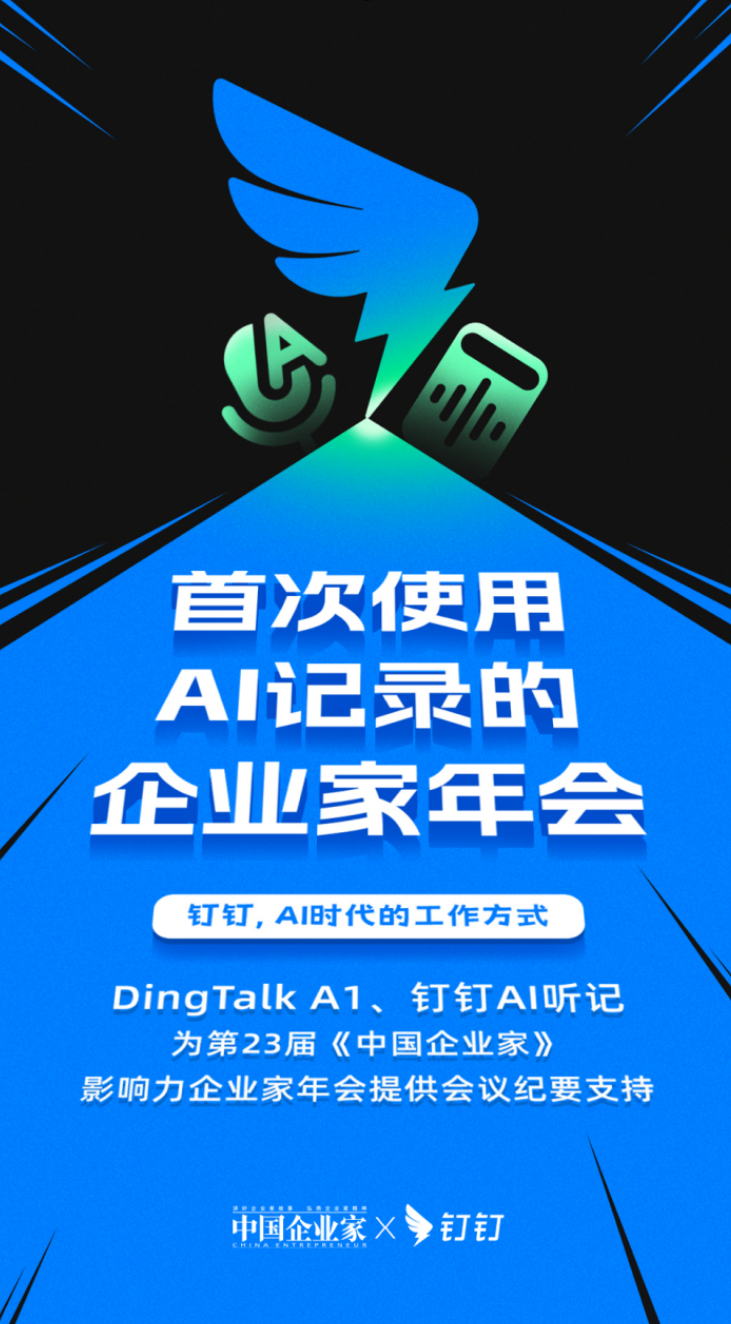 12月5日-7日,第23届《中国企业家》影响力企业家年会(原中国企业领袖年会)在北京举办,会议采取钉钉首款AI硬件DingTalk A1和钉钉AI听记记录并提供会议纪要,是中国企业领袖年会创办22年来首次使用AI记录的年会。