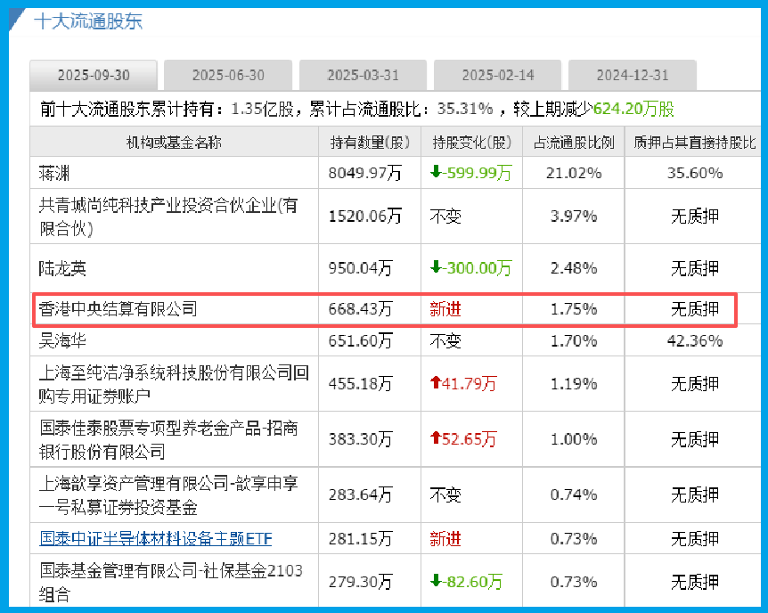 然而,就在同一页,“股东名录”栏一个名字引人注目:香港中央结算有限公司(北向资金)已成为公司第四大流通股东。