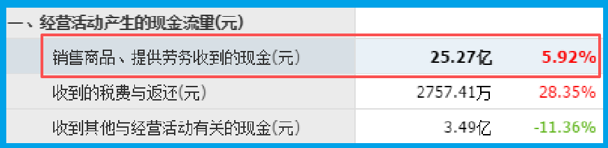 第一项关键物证是现金流:销售商品收到的现金总额为25.27亿元,同比增长5.92%,且高于营业收入。