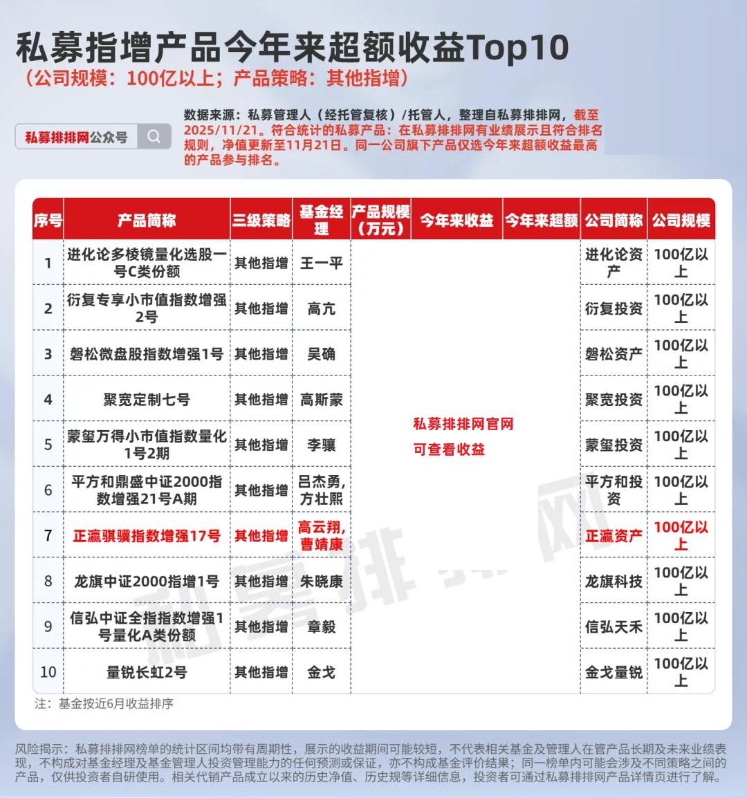 私募排排网数据显示,截至2025年11月21日,公司的指增产品“正瀛骐骥指数增强17号”在今年来取得了接近***%的超额收益,在100亿以上规模私募旗下其他指增策略产品中位列第7名。