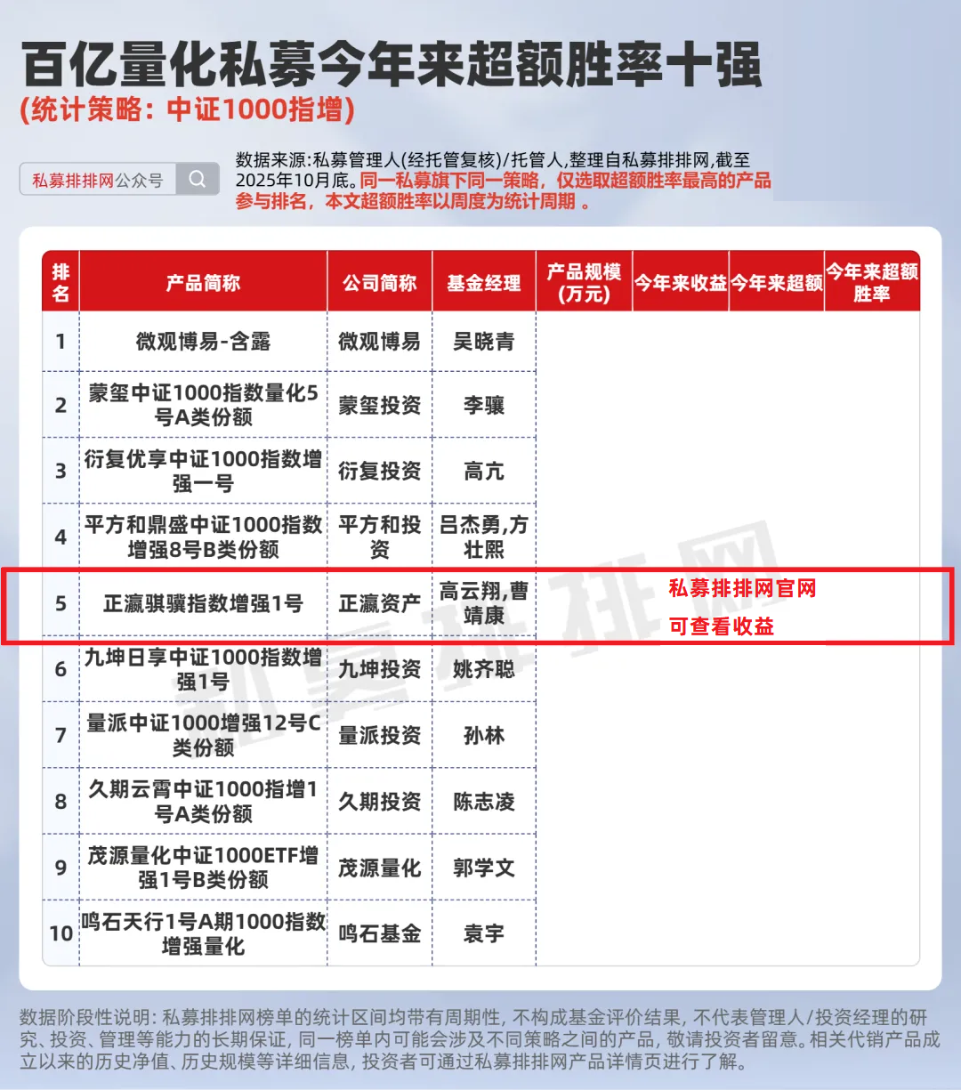 私募排排网数据显示,截至2025年10月底,在中证1000指增策略中,正瀛资产旗下产品“正瀛骐骥指数增强1号”今年来收益为***%,今年来超额为***%,今年来超额胜率为***%,位列百亿量化私募今年来超额胜率榜十强。