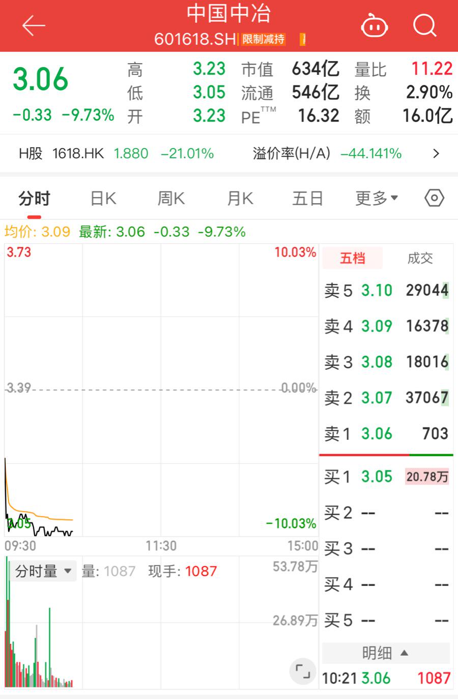 12月9日,央企控股上市公司中国中冶(601618.SH)股价出现明显异动,开盘后低开低走,盘中一度触及跌停。截至10时21分,公司股价报3.06元/股,跌幅达9.73%,市场反应与前一日晚间披露的巨额资产出售公告形成强烈呼应。