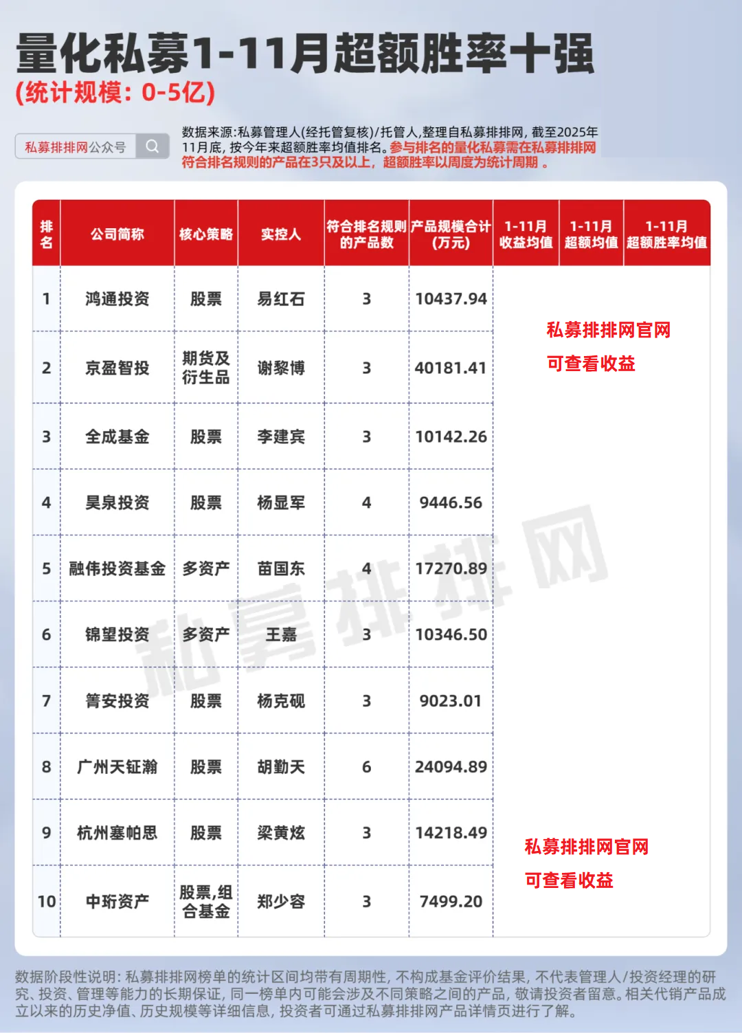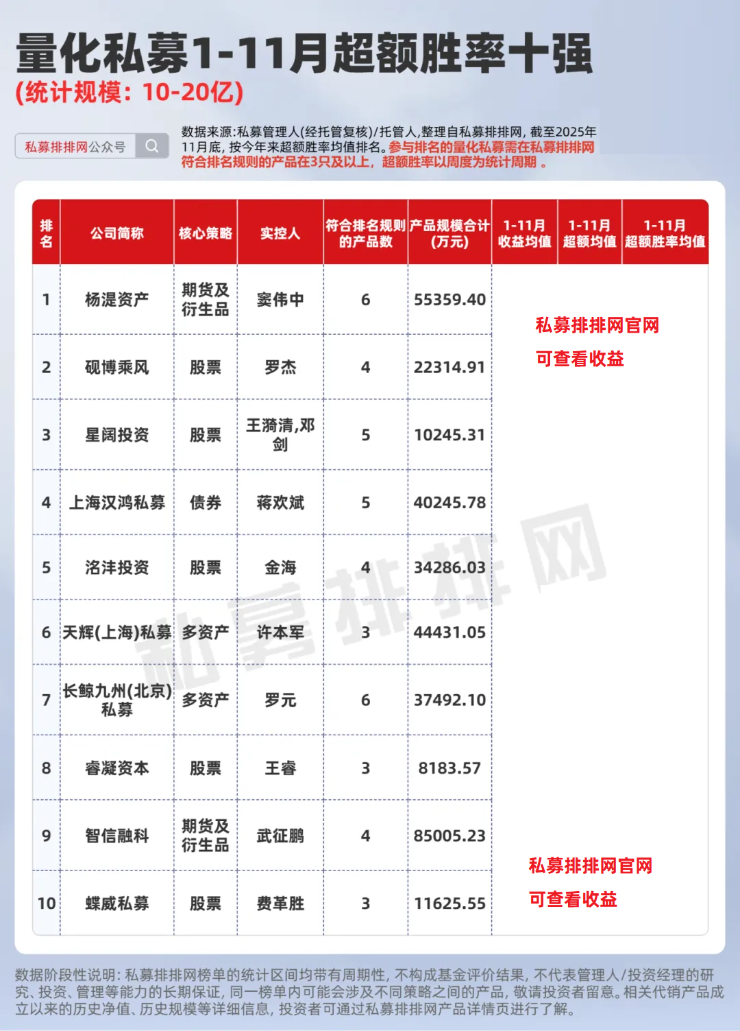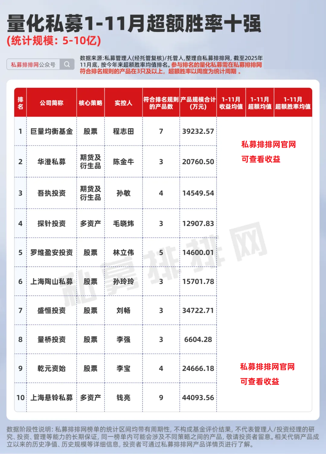 在量化行业进入“精耕细作”时代的当下,不仅关注谁在市场中跑得更快,更关注谁跑的更稳;为此本文按不同规模私募,分别梳理了旗下产品超额胜率均值位居前十的量化私募,供投资者参考。(参与排名的量化私募需在私募排排网符合排名规则的产品在3只及以上,本文超额胜率以周度为统计周期)
