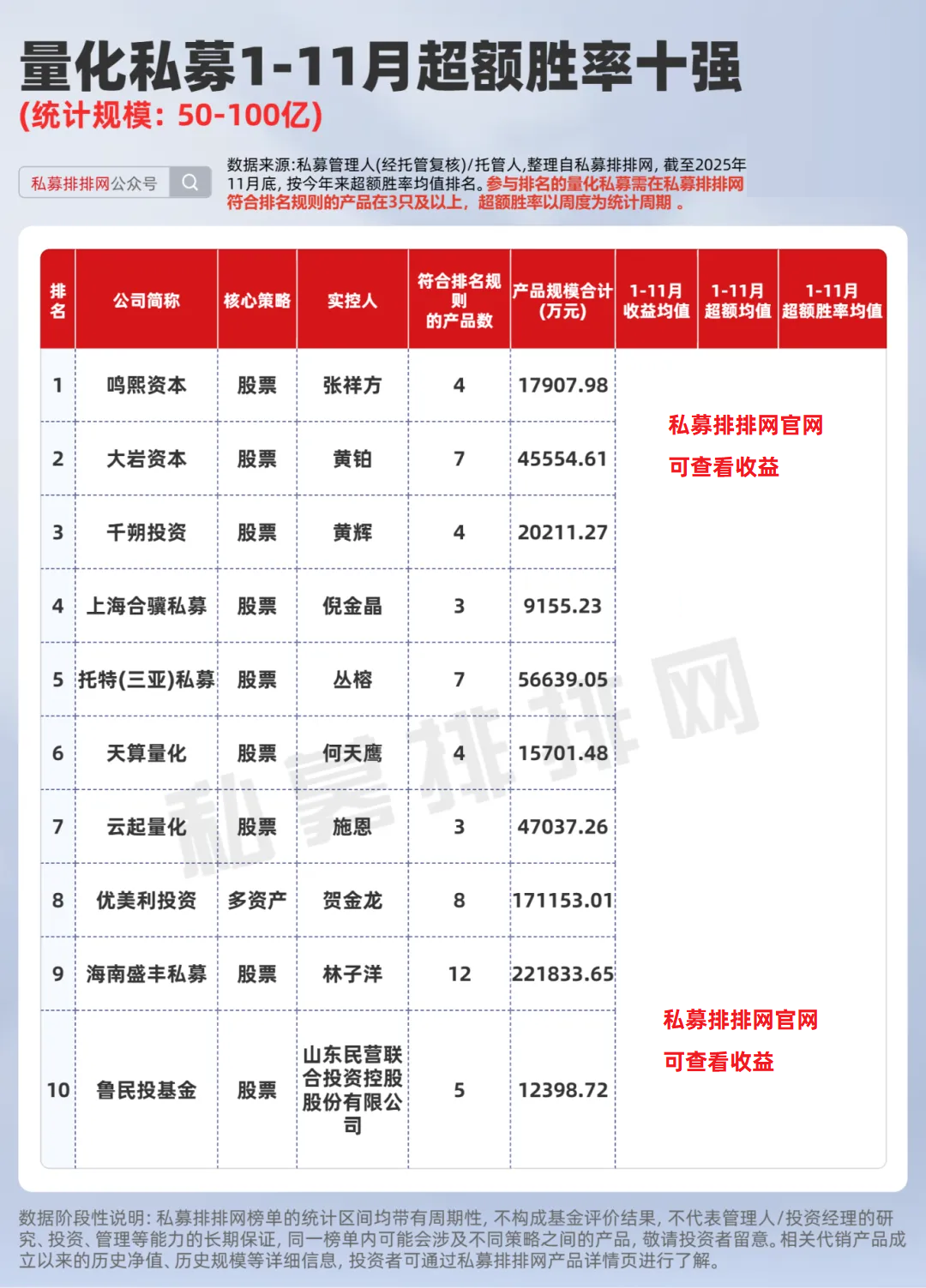 50-100亿:鸣熙资本领先!云起量化高超额高胜率!
