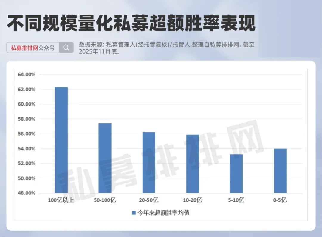 百亿量化私募凭借AI技术、算力、人才、风控等各方位优势,在量化模型的迭代上越发精进,维持了量化模型持续输出超额收益的能力。私募排排网数据显示,百亿量化私募旗下产品,1-11月实现超额胜率均值为62.28%,显著领先于其他规模私募;此外50-100亿、20-50亿、10-20亿、5-10亿、0-5亿的超额胜率呈现逐级递减的趋势。