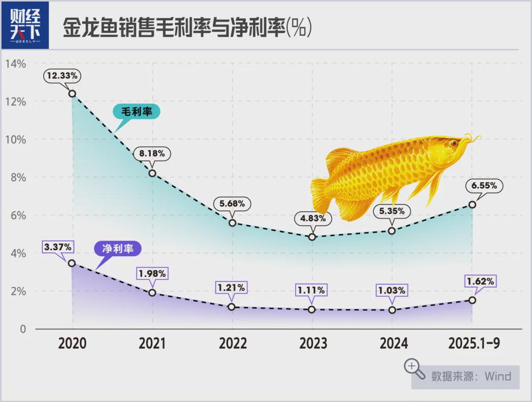 金龙鱼的销售毛利率长期在5%左右,销售净利率只有1.1%左右,扣非销售净利率更低,2023年、2024年及2025年前三季度分别为0.53%、0.41%、1.09%。