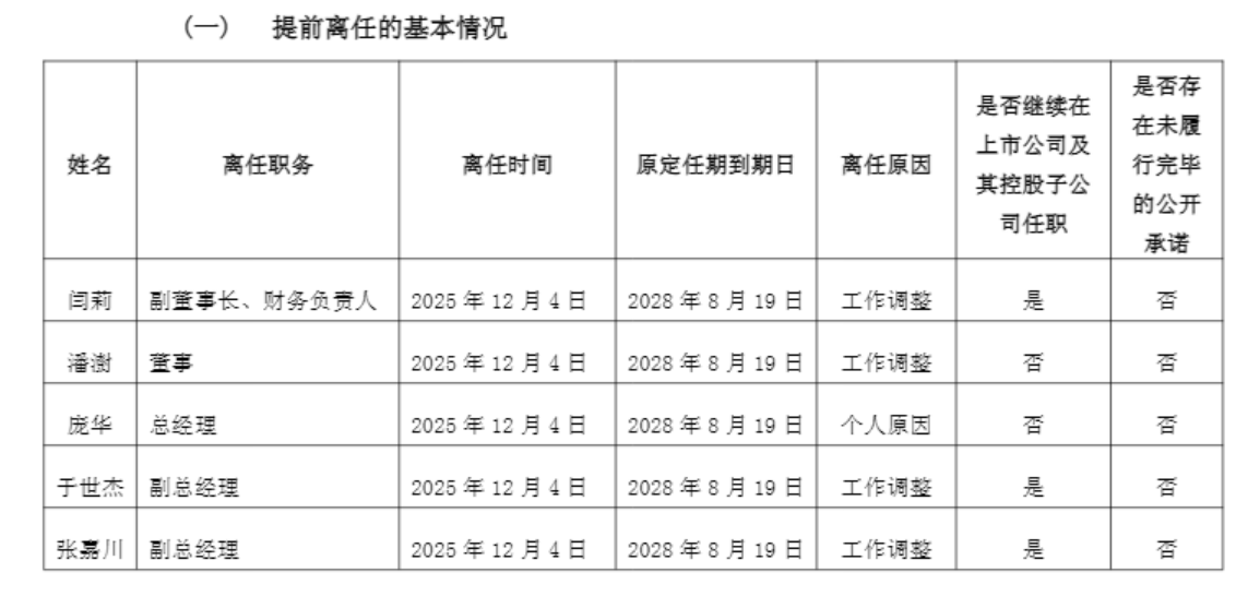 近日,大商股份发布公告称,该公司副董事长兼财务负责人闫莉、董事潘澍、总经理庞华以及副总经理于世杰、张嘉川共计五位董事及高管均于2025年12月4日提前离任。