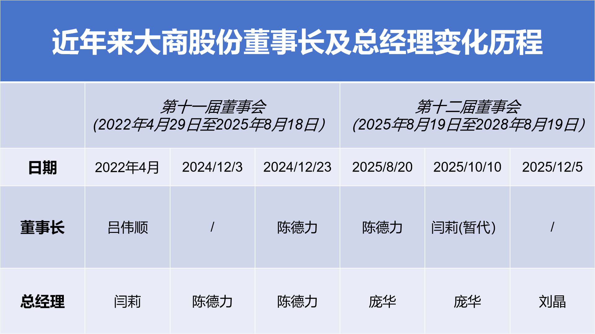 2024年12月3日,大商股份公告称,收到董事长吕伟顺和总经理闫莉的书面报告,不再担任公司董事长和总经理的职务。同时,公司聘任陈德力为总经理。同月底,陈德力被选举为大商股份董事长。