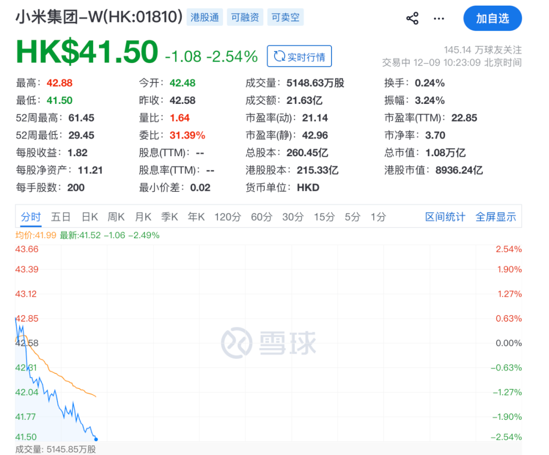 12月9日,截至发稿,小米集团报41.5港元/股,跌2.54%,市值为1.08万亿港元。股价相较于近期61.45港元的高点,已下跌超30%。